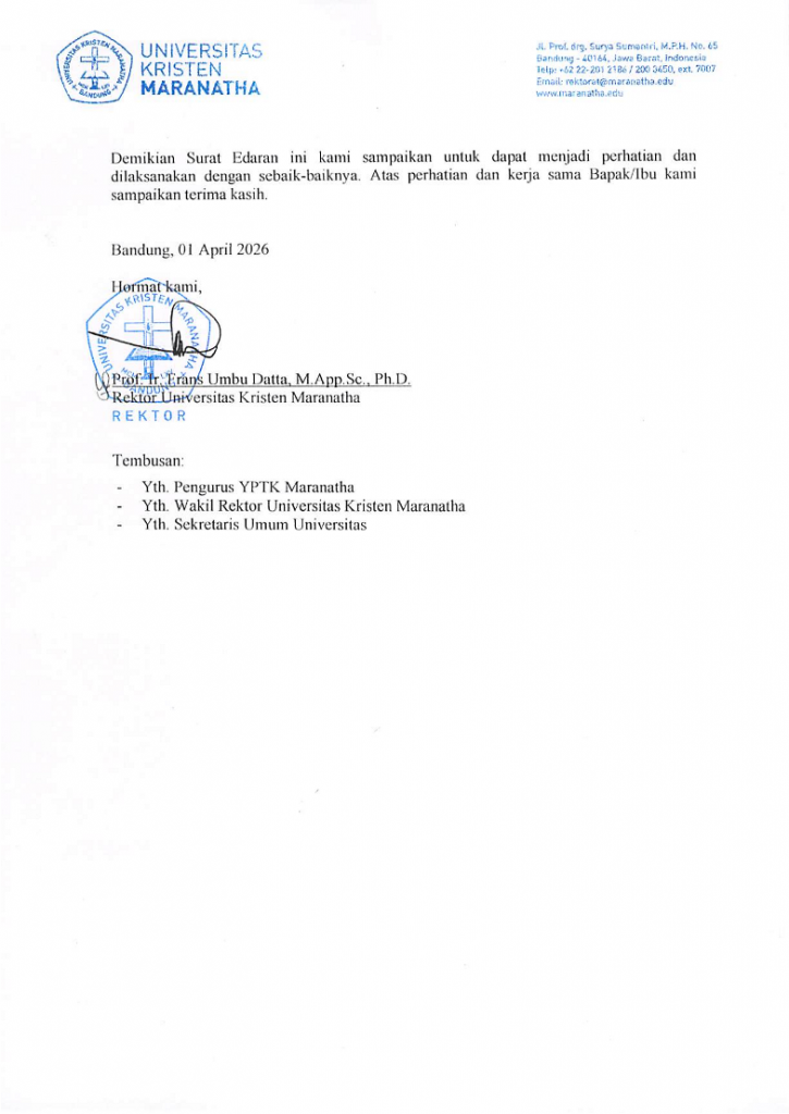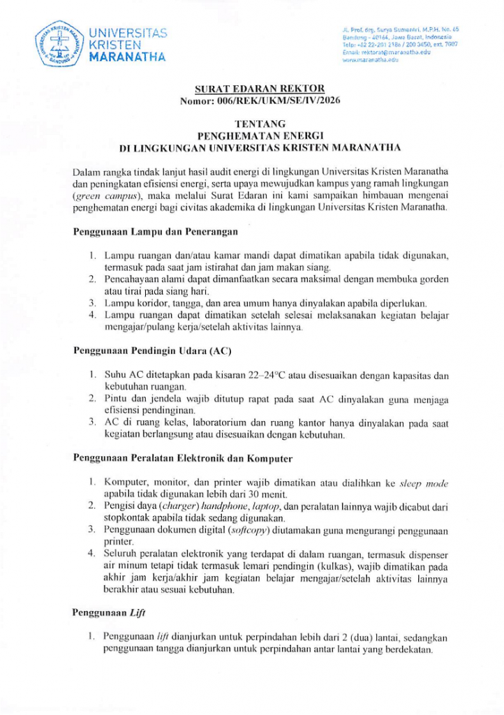 Berikut ini himbauan mengenai penghematan energi bagi civitas akademika di lingkungan Universitas Kristen Maranatha Berdasarkan Surat Edaran Rektor no. 006/REK/UKM/SE/IV/2026